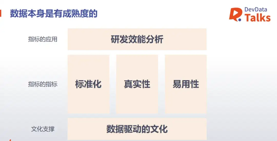 通过持续建设数据质量,实现数据的准确、规范和便捷使用,进而揭示数据趋势,指导后续的优化行动。这一系列工作本质上是研发效能体系的全面建设,涵盖从解决数据不准确、提升数据覆盖范围,到形成可分析的数据集合,最终依据分析结果采取管理措施的全过程。简言之,以数据为基础,通过不断优化数据质量与研发流程,逐步推进研发效能体系的成熟与效能提升。