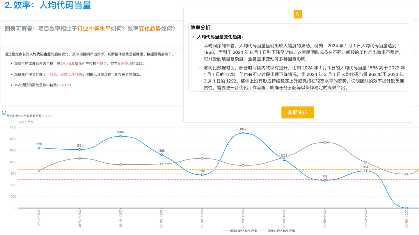 第二个角度是,将 AI 应用于度量的结果之上。在我们得到研发效能数据之后,各位可能经常会需要撰写一些报告,而撰写报告是一件比较麻烦的事情。看这张图中,有两条曲线,蓝色的曲线代表某段时间的代码当量人均值(代码当量是通过程序分析计算的代码复杂度和规模指标),灰色的曲线代表同比时段。大体上我们能够看出一些趋势,但如果能够利用 AI 的话,就可以更加详细地对数据进行对比和描述。目前,我们还在尝试在这个分析过程中,更多地给大模型提供一些基本的研发效能领域知识,可能会让 AI 能够给我们提供更多的建议,从而使得我们在撰写报告的时候,能够更加轻松一些。