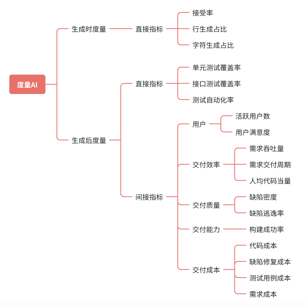 除了代码生成时的度量,代码生成后虽然无法再区分哪些由 AI 生成,但是我们可以通过其他一些直接或者间接的指标来度量 AI 产生的效果。
