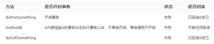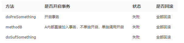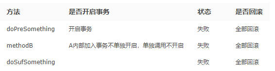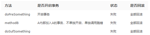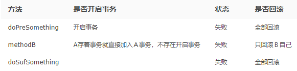 如果调用方法A,会开启一个事务,在方法A内部调用方法B,由于方法A已经存在开启尚未提交的事务,方法B会直接加入方法A的事务中执行,这样如果在执行方法B的时候出了异常导致事务回滚,则B的方法和A的方法都会回滚。如果A的doPreSomething()和方法B都执行成功了,但是在执行doSufSomething()方法的时候抛出了异常导致事务回滚,则doSufSomething()、methodB()和doPreSomething()都会回滚。