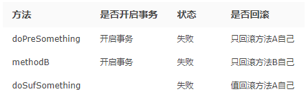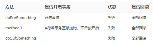 如果调用方法A,会开启一个事务,在方法A内部调用方法B,由于方法A已经存在开启尚未提交的事务,方法B不会就不会再开启一个新的事务,方法B会直接加入方法A的事务中执行,这样如果在执行方法B的时候出了异常导致事务回滚,则B的方法和A的方法都会回滚。如果A的doPreSomething()和方法B都执行成功了,但是在执行doSufSomething()方法的时候抛出了异常导致事务回滚,则doSufSomething()、methodB()和doPreSomething()都会回滚。