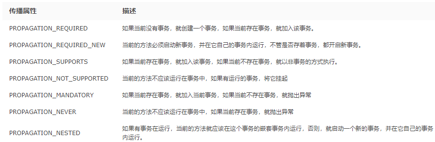 PROPAGATION_NOT_SUPPORTED如果存着事务就挂起当前事务,以非事务的方式运行自己,如果当前不存在事务,则不会创建新的事务,以非事务的方式执行。