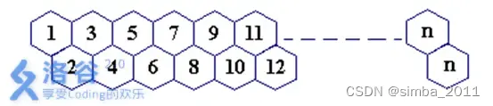 一只蜜蜂在下图所示的数字蜂房上爬动,已知它只能从标号小的蜂房爬到标号大的相邻蜂房,现在问你:蜜蜂从蜂房 m 开始爬到蜂房 n,m<n,有多少种爬行路线?(备注:题面有误,右上角应为n−1)