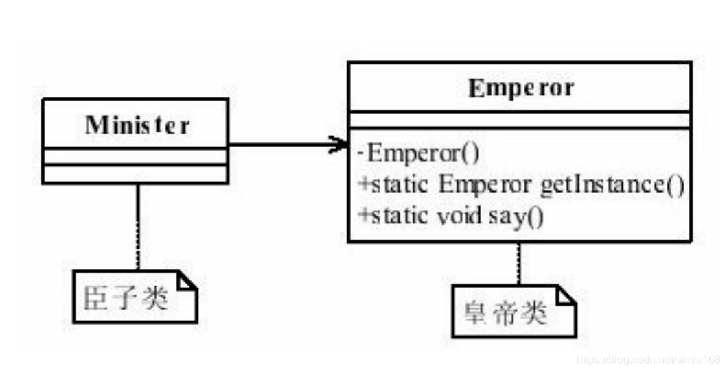 皇帝每天要上朝接待臣子、处理政务,臣子每天要叩拜皇帝,皇帝只能有一个,也就是一个类只能产生一个对象,该怎么实现呢?对象产生是通过new关键字完成的(当然也有其他方式,比如对象拷贝、反射等),这个怎么控制呀,但是大家别忘记了构造函数,使用new关键字创建对象时,都会根据输入的参数调用相应的构造函数,如果我们把构造函数设置为private私有访问权限不就可以禁止外部创建对象了吗?臣子叩拜唯一皇帝的过程如类图7-1所示。