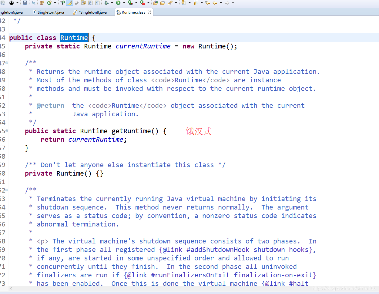 1) 我们 JDK 中,java.lang.Runtime 就是经典的单例模式(饿汉式)