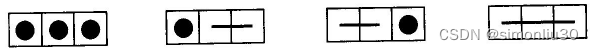 有 1×n 的一个长方形,用一个 1×1、1×2 和 1×3 的骨牌铺满方格。例如当 n=3 时为 1×3 的方格。此时用 1×1、1×2 和 1×3 的骨牌铺满方格,共有四种铺法。如下图: