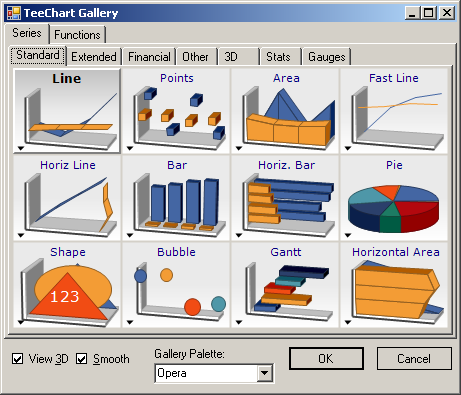 基本图表可以使用 TeeChart 编辑器构建和实现,几乎不需要或不使用代码。 TeeChart 编辑器是合二为一的两个编辑器,因为图表可能被认为与其数据系列内容不同。您可以定义图表外观、标题、图例特征和 3D 方面,而无需包含数据系列,这使您可以在运行时自由添加和删除不同的数据系列类型,而无需重新定义整个图表的外观和感觉。