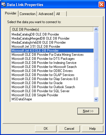 - 现在点击新窗口的“Provider”选项卡,选择“Microsoft Jet OLE DB Provider”,如下图所示: