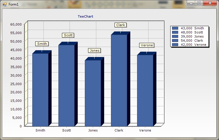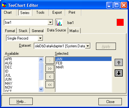 Single Record Charting 允许在 TeeChart 上显示来自单个数据库记录的所有或部分记录。 它可能对数据库视图或表格很有用,例如,每年的销售数据存储为单独的月份列,'JAN','FEB','MAR'..etc。 并逐步浏览记录显示连续年份的月销售额。