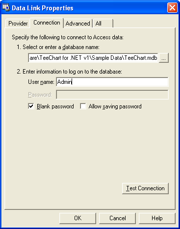 - 现在单击同一窗口的“连接”选项卡,然后从 TeeChart for .Net 根目录下的 Sample Data 文件夹中选择 TeeChart.mdb 文件: