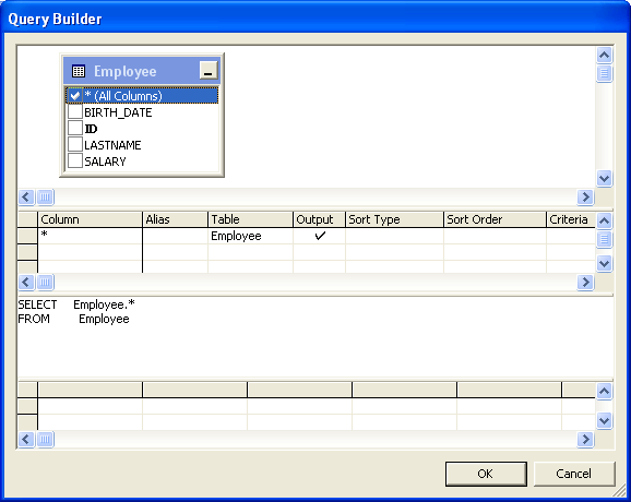 - 现在单击“Query Builder”按钮并添加“Employee”表。 关闭“添加表”窗口并选择“*(所有列)”复选框: