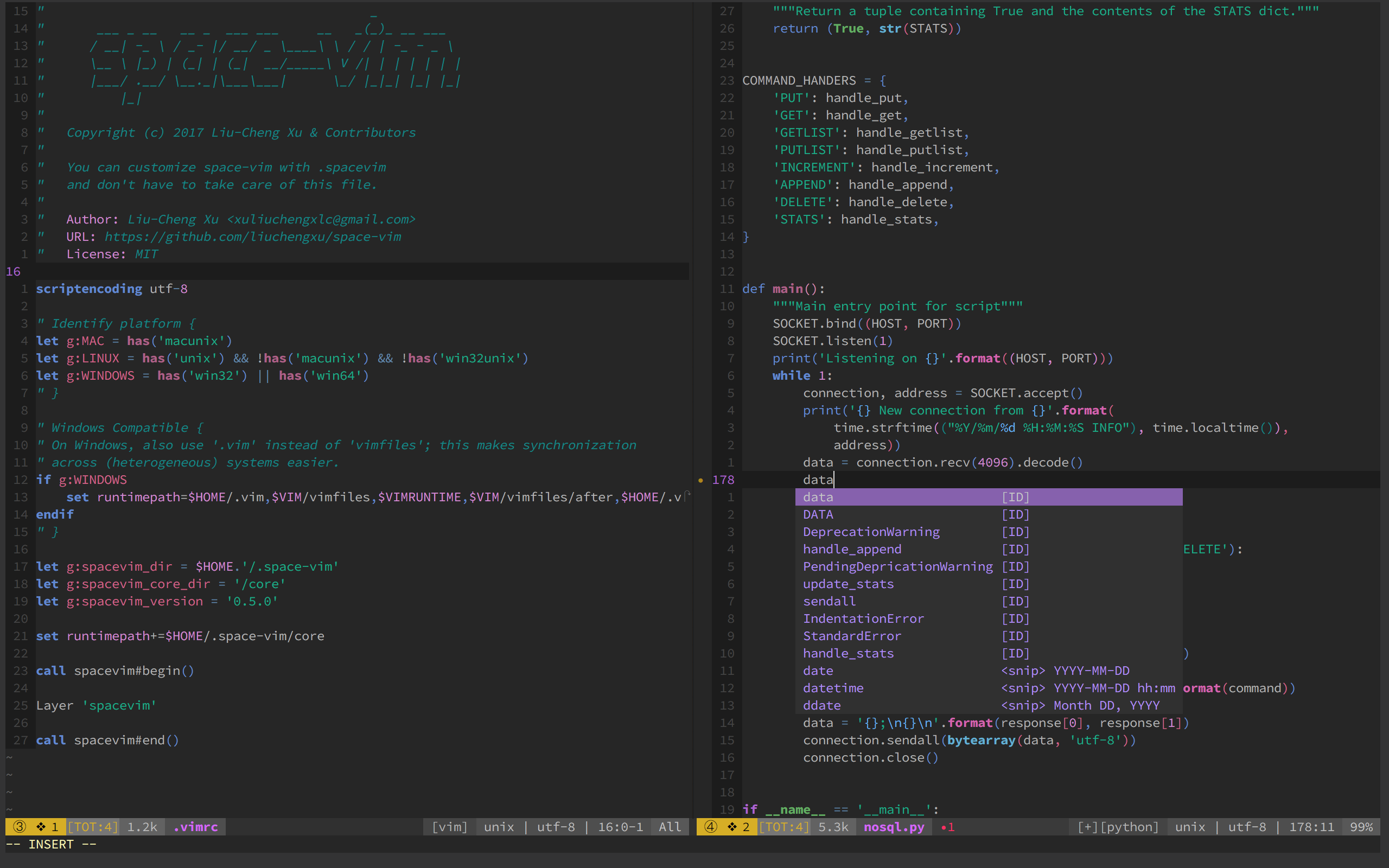 vim 社区中,虽有 spf13-vim, k-vim 等一些比较有名的 vim 配置,但始终整合的不够,散落着很多适用特定环境的很好的配置,比如针对 c-c++, python, ruby 等等不同语言的 vim 配置。还有大多也不够漂亮(当然了,这个有点主观,但不管怎么说,年轻人就是要挑“好看”的-_-)。