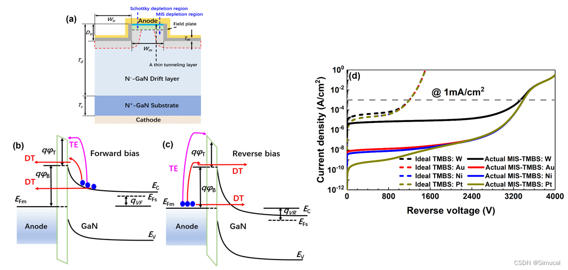 图3.(a)GaN基MIS-TMBS的结构示意图;GaN基MIS-TMBS肖特基接触界面附近存在的载流子传输机制:(b)正向偏置和(c)反向偏置;(d)具有不同的肖特基金属电极的理想TMBS整流器和实际MIS-TMBS整流器的反向I-V特性曲线。