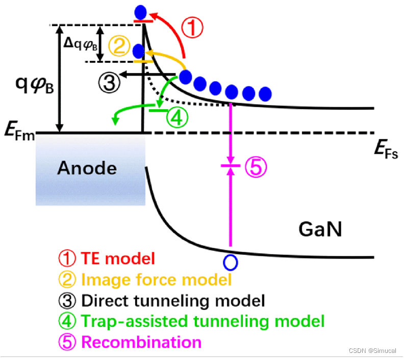 图1. 肖特基接触界面附近存在的载流子传输机制:① 热辐射过程,② 镜像力模型(虚线),③ 直接隧穿过程,④ 陷阱辅助隧穿过程,⑤ SRH非辐射复合过程。