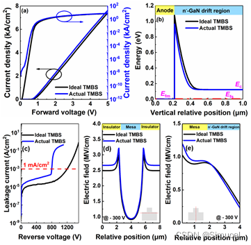 图2. 理想的TMBS整流器和实际的TMBS整流器的(a)正向I-V特性曲线,(b)导带分布和(c)反向I-V特性曲线;理想的TMBS整流器和实际的TMBS整流器的电场分布图:(d)横向分布(y=10.8μm),(e)纵向分布(x=4μm)。