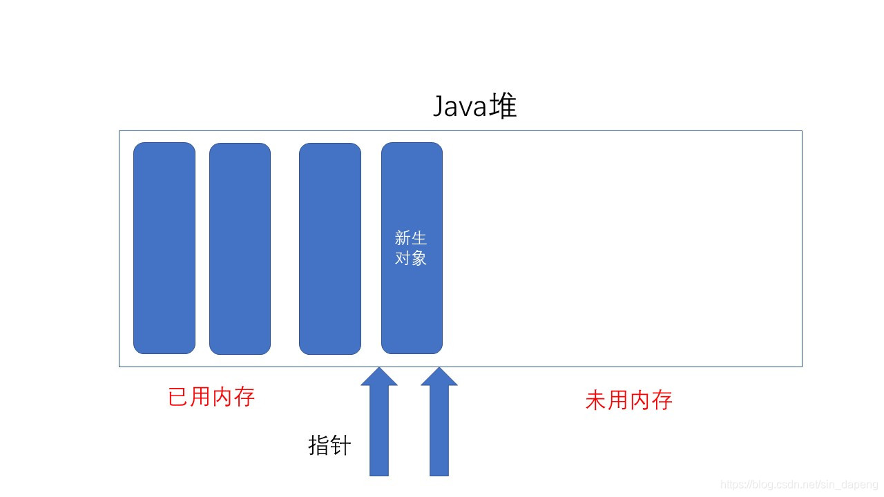 假设Java堆中内存是绝对规整的,所有用过的内存都放在一边,空闲的内存放在另一边,中间放着一个指针作为分界点的指示器,那所分配内存就仅仅是把那个指针向空闲空间那边挪动一段与对象大小相等的距离,这种分配方式称为“指针碰撞”(Bump the Pointer)。