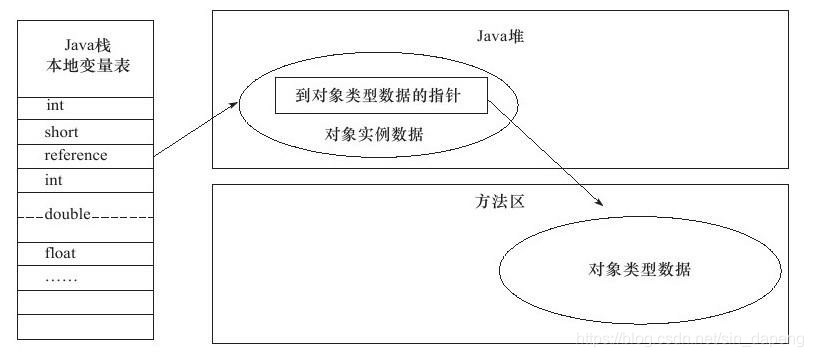 java堆中会划出一块内存作为句柄池,reference中存储的就是对象的句柄地址,而句柄中包含了对象实例数据与类型数据各自的具体地址信息。如图: