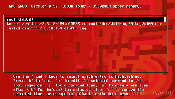 选择第二项,即:“kernel /vmlinuz-2.4.20-8 ro root=LABEL=/”。然后再按“e”编辑此项。