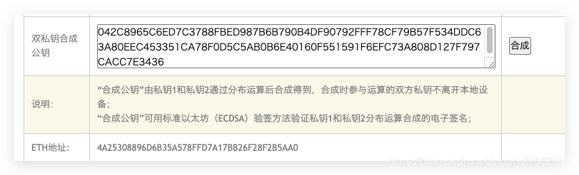 3.用户A将D1发送给用户B,用户B通过D1、D2合成公钥并得到以太坊地址,该公钥完全符合以太坊规范,基于ECDSA。