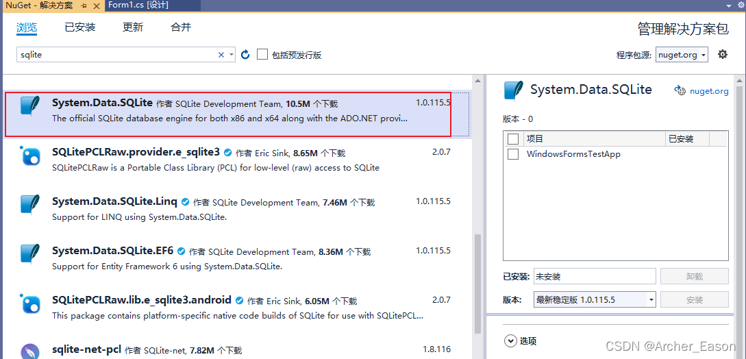 - 在VS上通过工具 >>Nuget包管理器找到System.Data.SQLite以最新稳定版安装即可