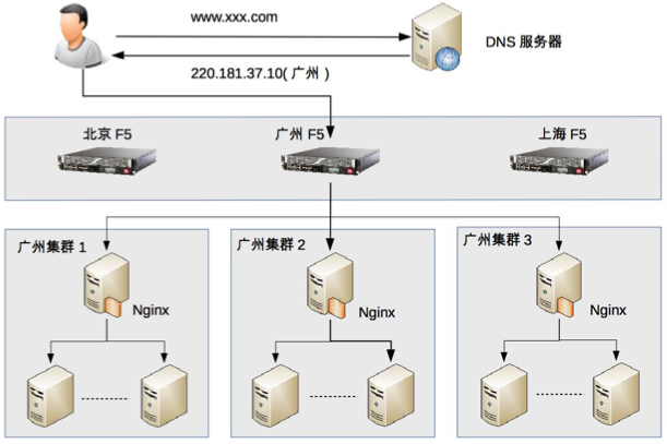 集群级别负载均衡:广州机房的负载均衡用的是 F5 设备,F5 收到用户请求后,进行集群级别的负载均衡,将用户请求发给 3 个本地集群中的一个,我们假设 F5 将用户请求发给了“广州集群 2”。