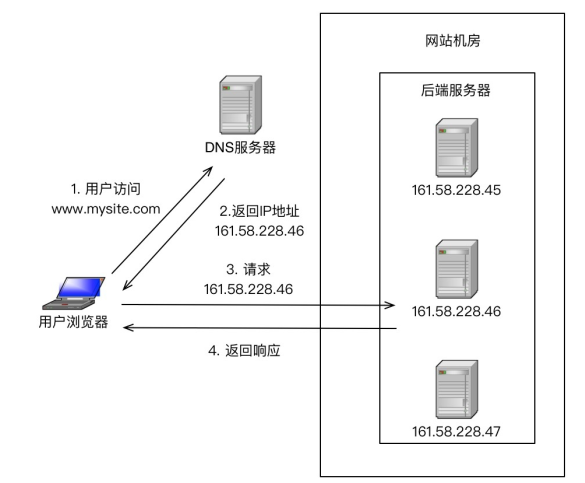 DNS 是最简单也是最常见的负载均衡方式,一般用来实现地理级别的均衡。例如,北方的用户访问北京的机房,南方的用户访问深圳的机房。DNS 负载均衡的本质是 DNS 解析同一个域名可以返回不同的 IP 地址。例如,同样是 www.baidu.com,北方用户解析后获取的地址是 61.135.165.224(这是北京机房的 IP),南方用户解析后获取的地址是14.215.177.38(这是深圳机房的 IP)。