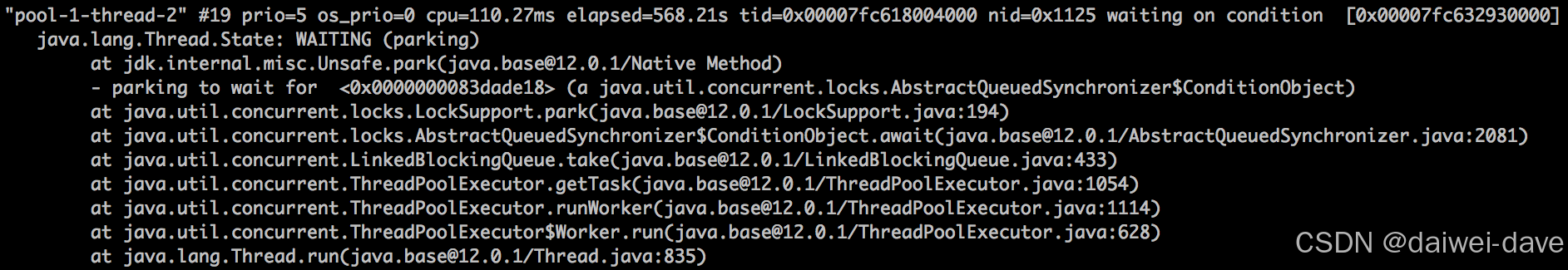 要弄清楚这个问题,我们还需要看 jstack 的输出结果,主要是看这些线程池中的线程是不是真的在干活,还是在“休息”呢?