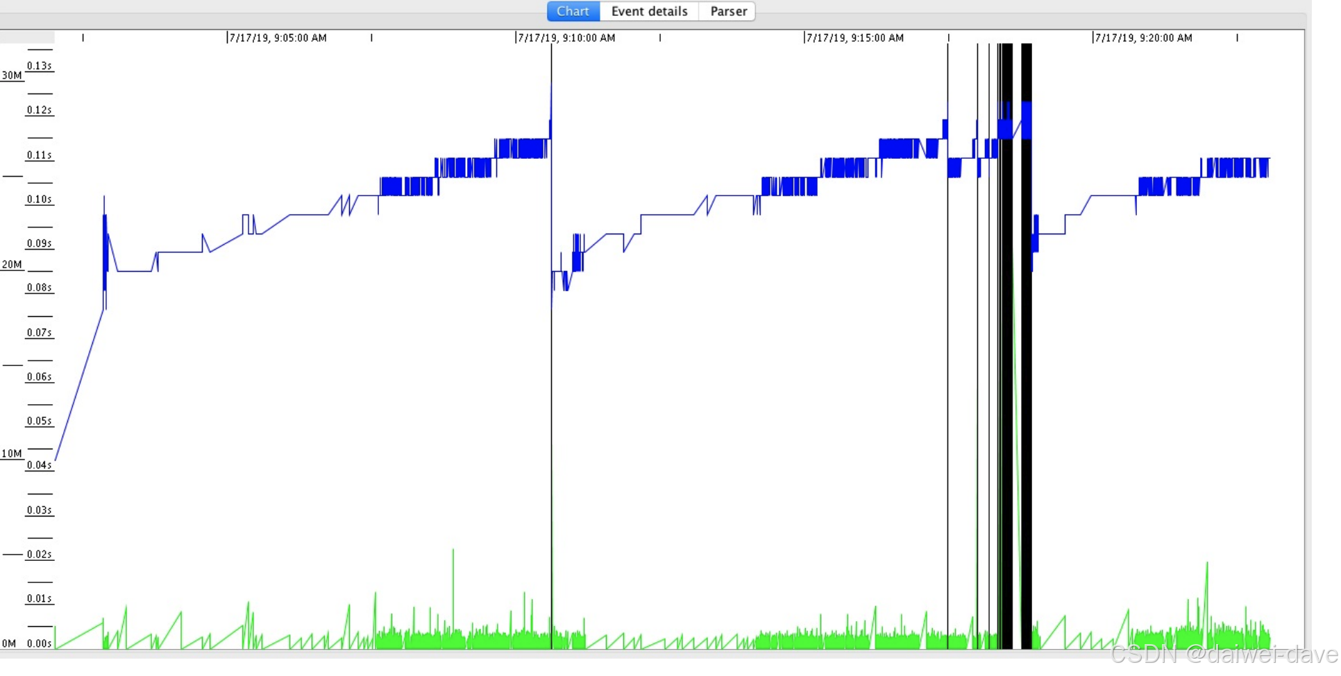 - 图底部的绿线表示年轻代GC活动,从图上看到当堆的使用率上去了,会触发频繁的GC活动。