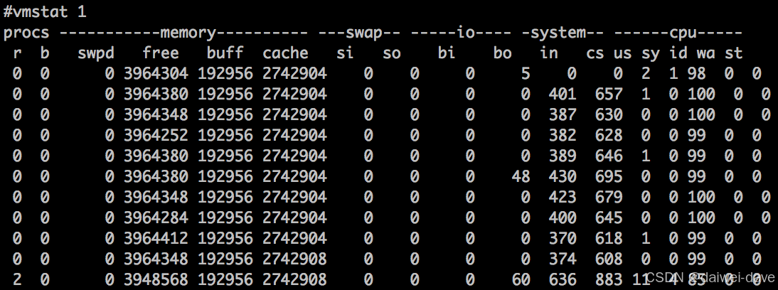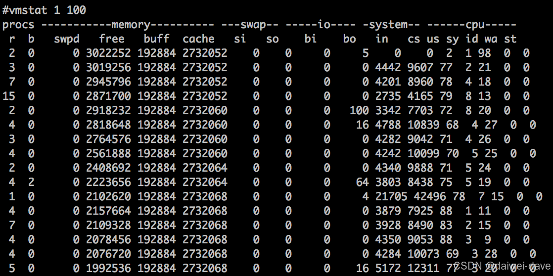 下面我们通过 vmstat 命令来查看一下操作系统层面的线程上下文切换活动: