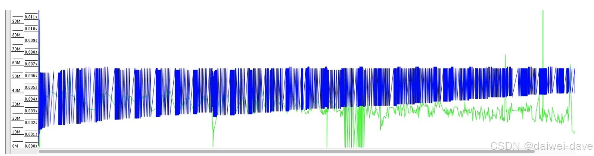 - 图中上部的蓝线表示已使用堆的大小,我们看到它周期的上下震荡,当堆大小在32MB左右时,会被较大幅度清理