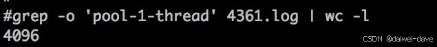 回到我们的“pool-1-thread-x”线程,这些线程都处在“Waiting”状态,从线程栈我们看到,这些线程“等待”在 getTask 方法调用上,线程尝试从线程池的队列中取任务,但是队列为空,所以通过 LockSupport.park 调用进到了“Waiting”状态。那“pool-1-thread-x”线程有多少个呢?通过下面这个命令来统计一下,结果是 4096,正好跟线程池中的线程数相等。