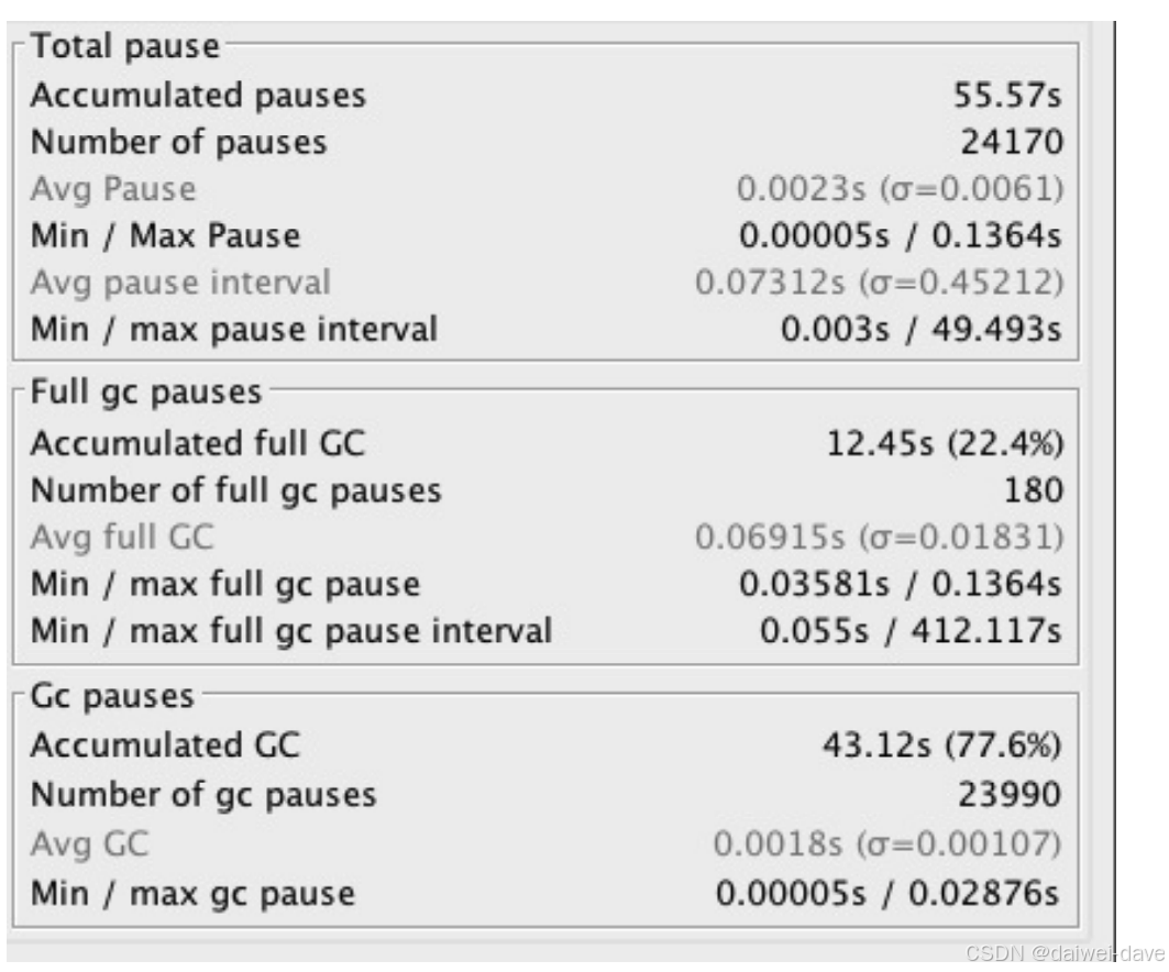 我们通过GCViewer还发现累计GC暂停时间有55.57秒,如下图所示: