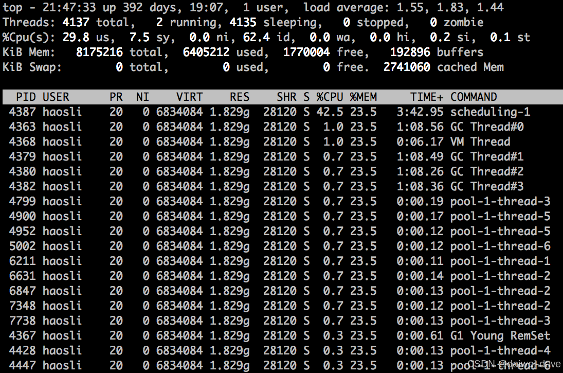 但是对于这个实例的问题,你是否发现这样一个情况:Java 进程占用的 CPU 是 262.3%, 而“scheduling-1”线程只占用了 42.5% 的 CPU,那还有将近 220% 的 CPU 被谁占用了呢?