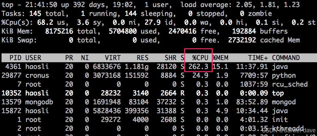 使用 top 命令,我们看到 Java 进程的 CPU 使用率达到了 262.3%,注意到进程 ID 是 4361。