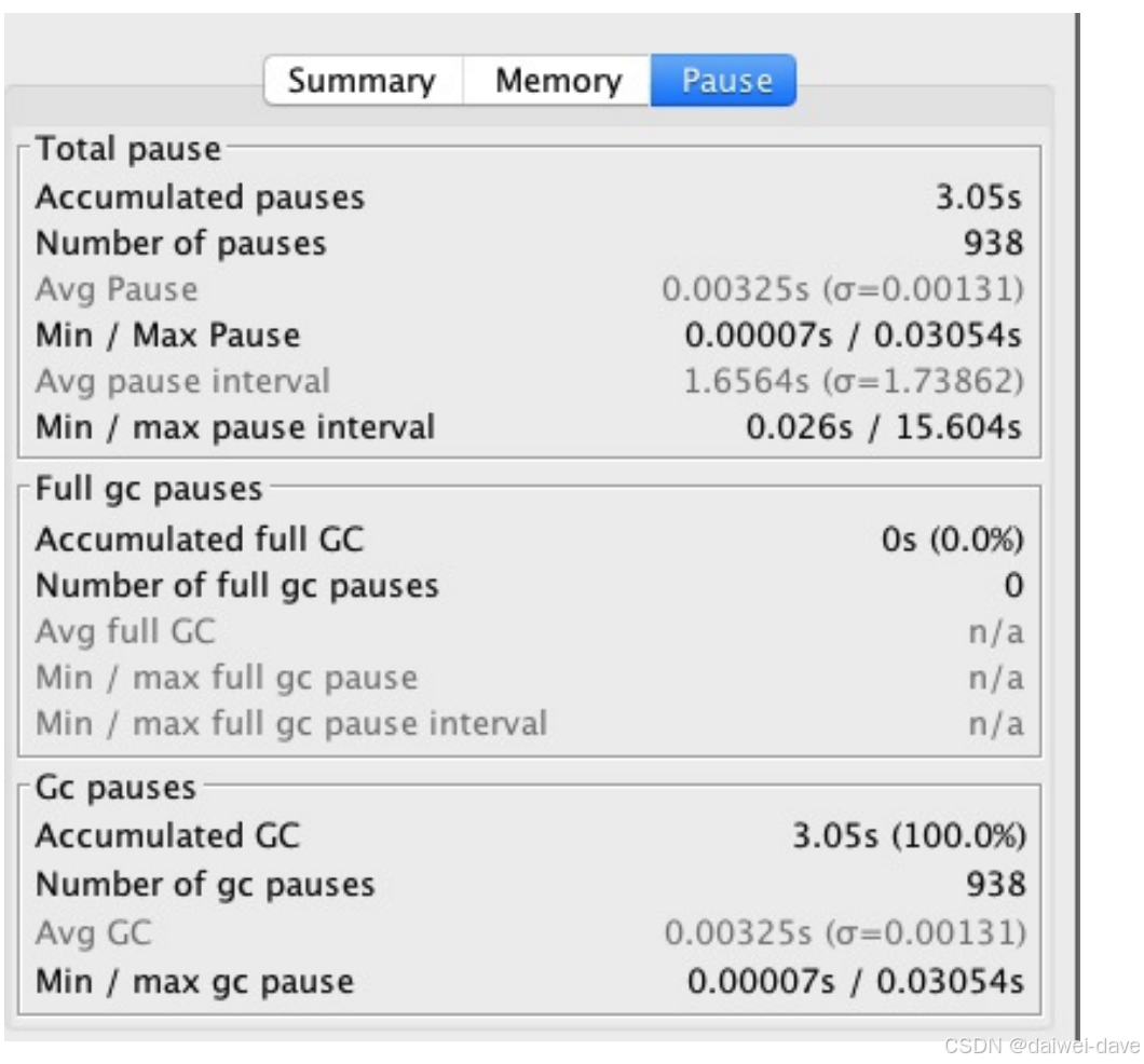 你可以看到,没有发生Full GC(无黑色的大竖线,内存下降幅度较小),并且年轻代GC也没有那么频繁了,并且累计GC暂停时间只有3.05秒。