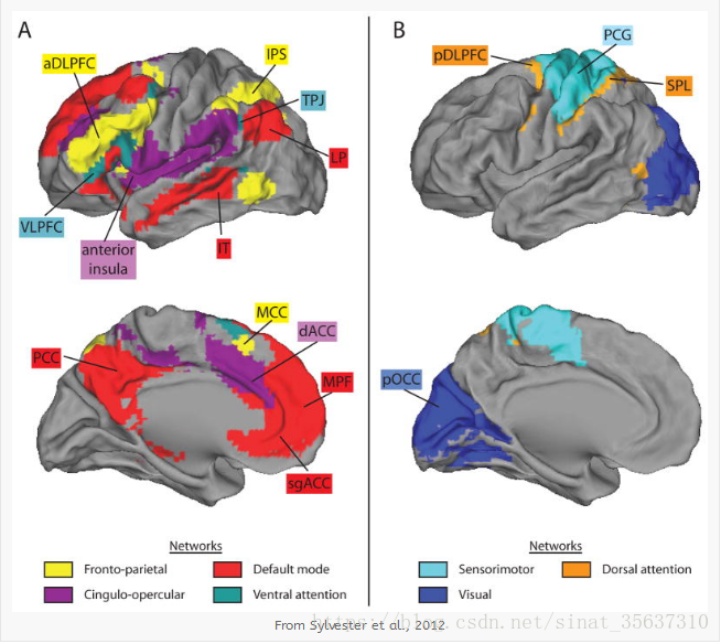 Dorsal attention network (DAN) orange; ventral attention network (VAN) blue. From Aboitiz et al (2014)