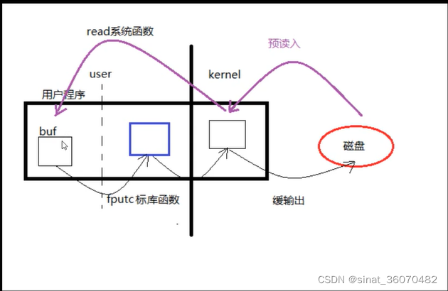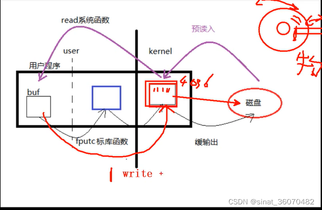 相当于说在fputc函数内部有一个buff(蓝色)大小默认也是4K,所以要满4K后,然后再进内核。