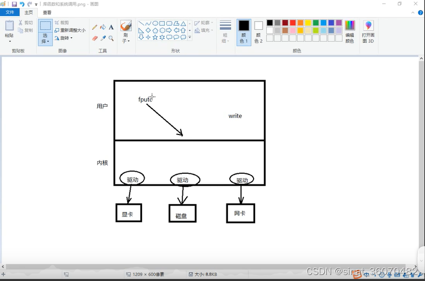 fputc的话,没有办法直接进入内核,应该向下调用write,因为只用系统调用才能进入系统内核空间,进入内核以后,才有办法去调用驱动层,最终驱动硬件工作。