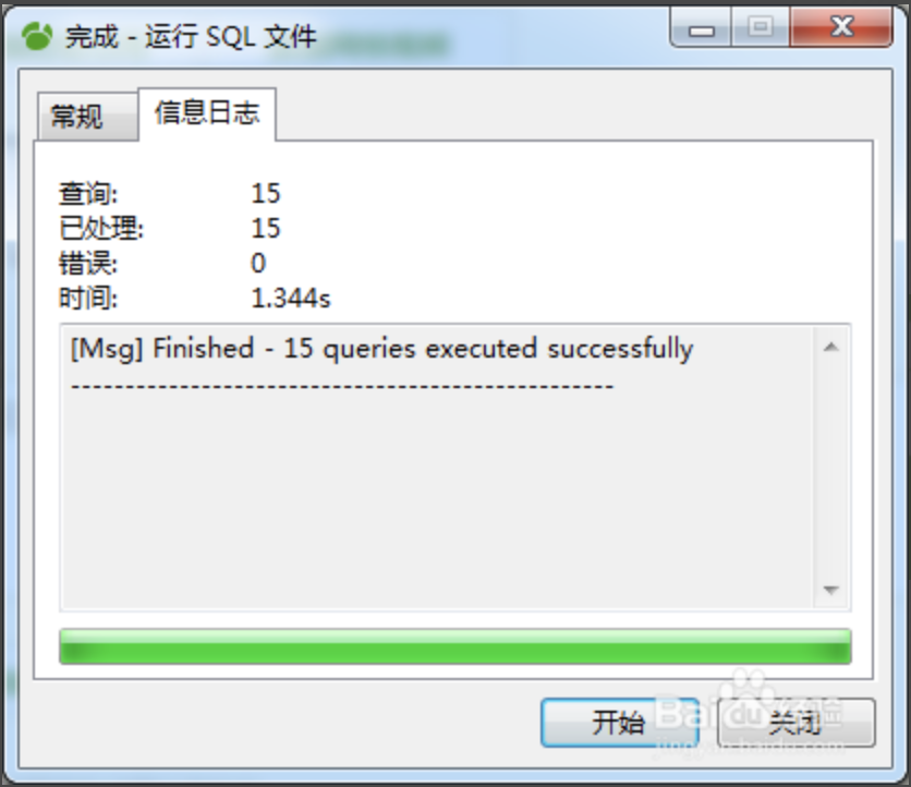 选中之后,点击确定,它就会运行sql语句。如果成功,会有如下相关的信息显示。点击关闭。
