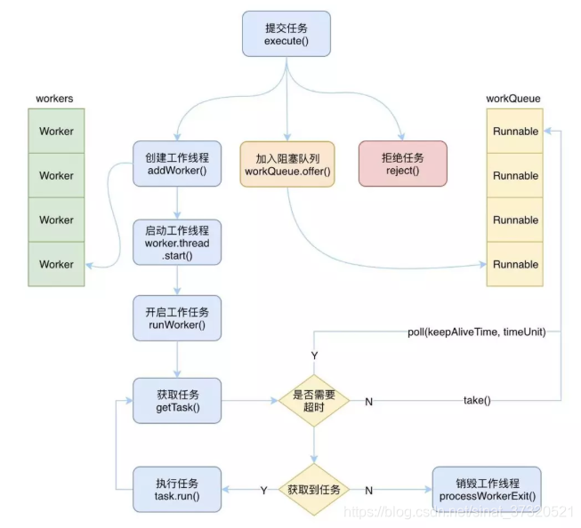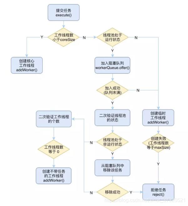 上图是一张线程池工作的精简图,实际的过程比这个要复杂的多,不过这些应该能够完全覆盖到线程池的整个工作流程了。