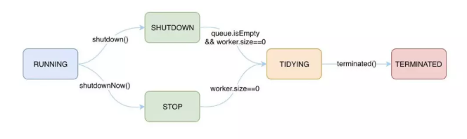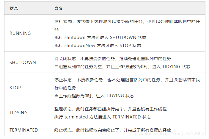 首先线程池是有状态的,这些状态标识这线程池内部的一些运行情况,线程池的开启到关闭的过程就是线程池状态的一个流转的过程。