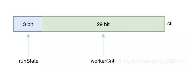 ctl 的高3位用来表示线程池的状态(runState),低29位用来表示工作线程的个数(workerCnt),为什么要用3位来表示线程池的状态呢,原因是线程池一共有5种状态,而2位只能表示出4种情况,所以至少需要3位才能表示得了5种状态。