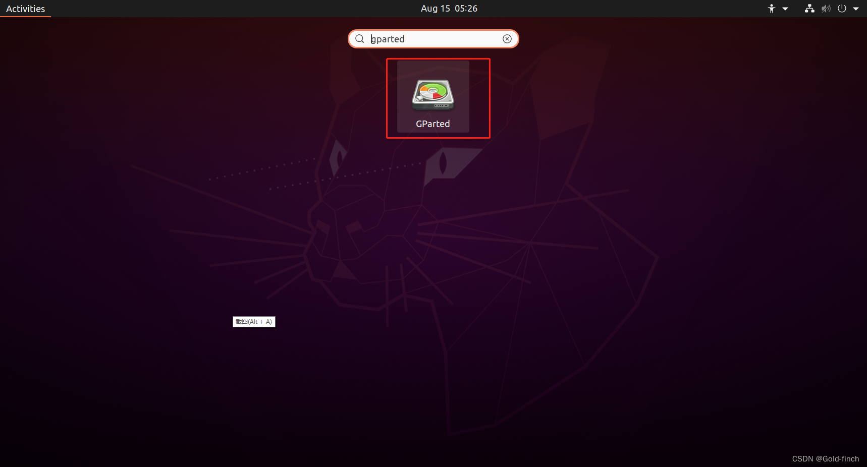 2、使用gparted 工具,在如上图左下角搜索gparted,如果没有执行指令安装sudo apt install gparted,安装后打开