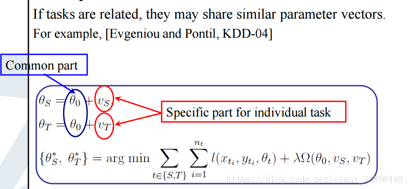 Parameter-transfer的思想是如果在源域中已经训练好了一个模型,两个任务又是相关的,那么可以把这个模型和参数用到目标域中来。找到源域和目标域的共同的参数,将模型转化为共同参数加上代表各自特殊性的参数。