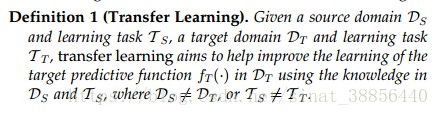 迁移学习的定义:有源域Ds和任务Ts;目标域Dt和任务Tt,迁移学习的目标是利用源域中的知识解决目标域中的预测函数f,条件是源域和目标域不相同或者源域中的任务和目标域中的任务不相同。