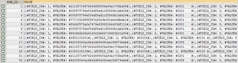 SELECT ROW_ID, CAST(CONCAT('[', GROUP_CONCAT('{\'FIELD_ID\'', ' : ', IF(INSTR(VALUE, '[{') = 0, CONCAT('\'', VALUE, '\''), VALUE), '}'), ']') AS BINARY) FROM T_TASK_DATA GROUP BY ROW_ID