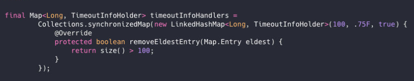 当容量超过100时,开始执行LRU策略:将最近最少未使用的 TimeoutInfoHolder 对象 evict 掉。