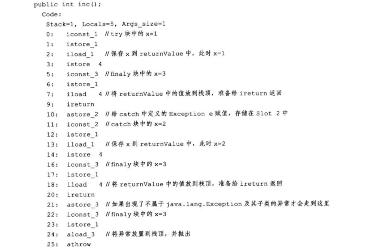 字节码0~34行所做的操作就是将整数1赋值给变量x,并且将此时x的值复制一份副本到最后一个本地变量表的Slot中。如果没有异常出现,会继续走5~9行,将变量x赋值为3,之前保存的Slot的整数1读入到操作栈顶,最后Slot指令会以int形式返回栈顶中的值,方法结束。如果出现了异常,PC寄存器指针转到第10行,第10~20行是将2赋值给变量x,然后将变量x此时的值给Slot,最后在将变量x的值改为3。方法返回前同样将Slot中保留的整数2读到了栈顶。第21行开始,是变量x的值赋为3,并将栈顶的异常抛出,方法结束。