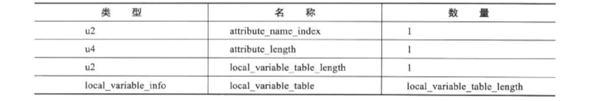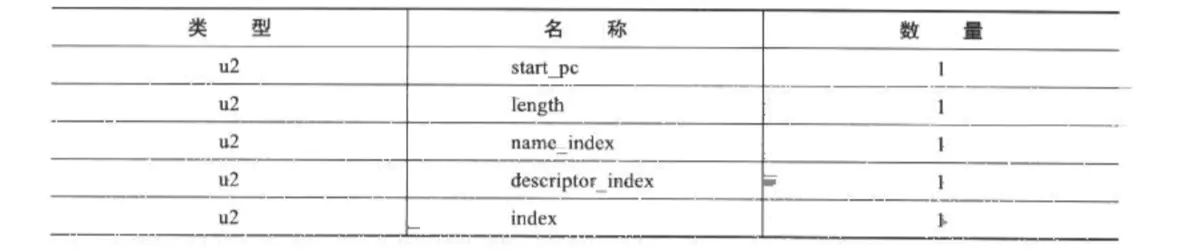 其中,local_variable_info项目代表了栈帧与源码中的局部变量的关联,结构表如下: