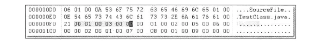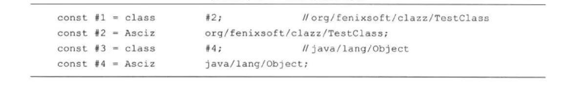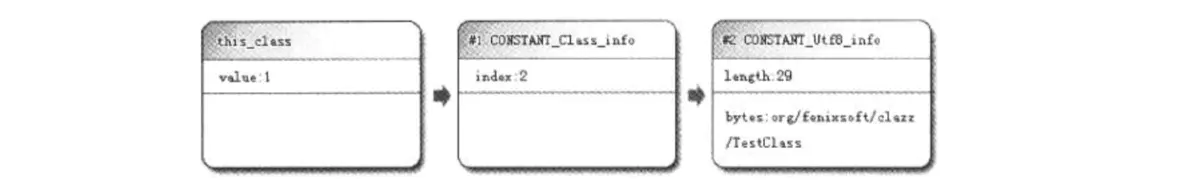 从偏移地址0x000000F1开始的3个u2类型的值分别是0x0001、0x0003、0x0000,也就是类索引是1,父类索引是3,接口索引集合大小为0。对应前面使用javap查询的常量池,找出对应的类和父类常量如下所示: